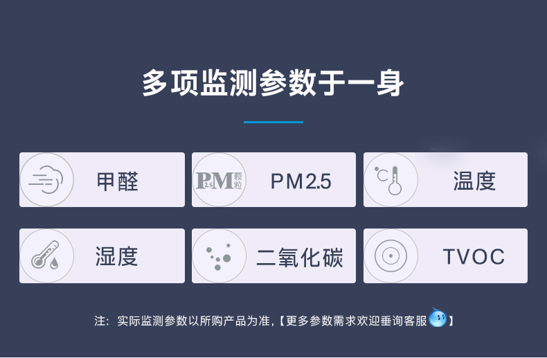 二氧化碳、温度、湿度、颗粒物、TVOC、甲醛、氨气、硫化氢、氧气、二氧化硫等,以实际所购版本为准。